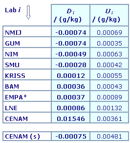 | The degree of equivalence between two laboratories is given by a pair of terms: Dij = Di - Dj = xi - xj, and Uij, its expanded uncertainty (k = 2), both expressed in g/kg, Uij = 2(ui2 + uj2)1/2. The values of the pair-wise degrees of equivalence are not given here. |
