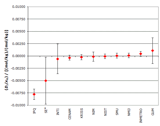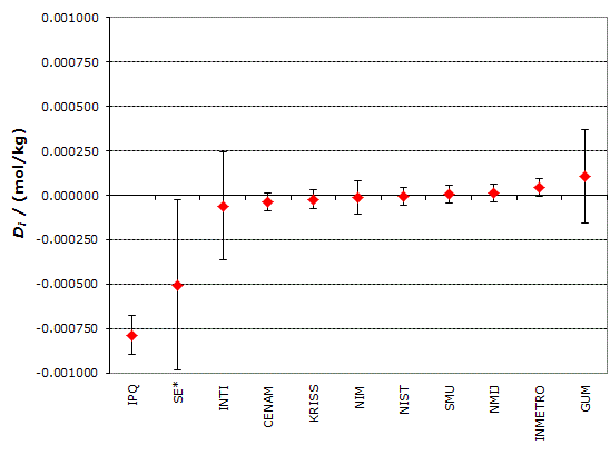 Degrees of equivalence Di and expanded uncertainty Ui (k = 2) expressed in mol/kg