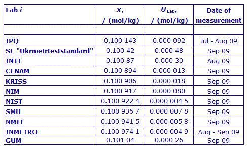 The key comparison reference value, xR, and its standard uncertainty, uR, are calculated as explained on page 12 of the Final Report. xR = 0.100 929 2 mol/kg and uR = 0.000 010 9 mol/kg