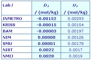| The degree of equivalence of laboratory i relative to the key comparison reference value is given by a pair of terms, both expressed in mol/kg: Di = (xi - xR) and its expanded uncertainty Ui (k = 2) where Ui = 2(ui2 + uR2)1/2. |