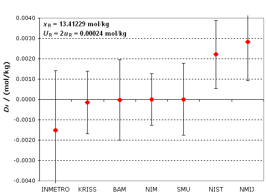 The key comparison reference value, xR, is calculated as the median of the participant results. Its standard uncertainty, uR, is computed as explained in section 7.3 of the Final Report. xR = 13.41229 mol/kg, uR = 0.00012 mol/kg |