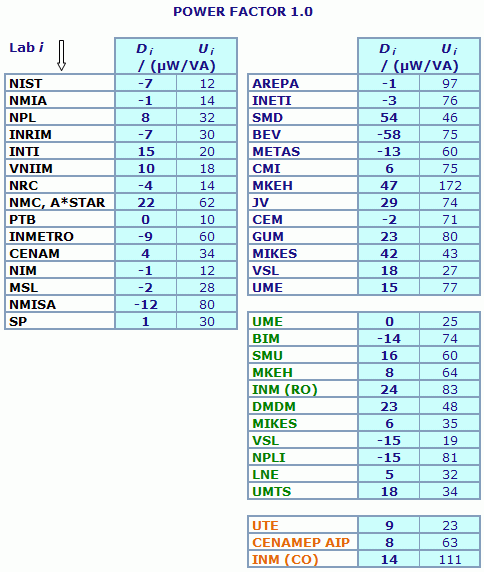 | The degree of equivalence of each laboratory with respect to the key comparison reference value is given by a pair of terms: Di and Ui, its expanded uncertainty (k = 2), both expressed in µW/VA. The derivation of these terms can be found in the CCEM-K5 Final Report. |