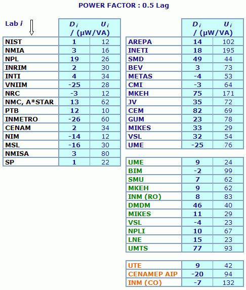 | When required, the degree of equivalence between two laboratories i and j is given by a pair of terms: Dij and Uij, its expanded uncertainty (k = 2), both expressed in µW/VA. The derivation of these terms can also be found in the CCEM-K5 Final Report. |