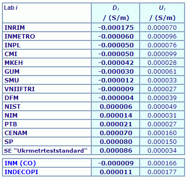 Degrees of equivalence, Di and expanded uncertainty Ui (k = 2), expressed in S/m