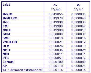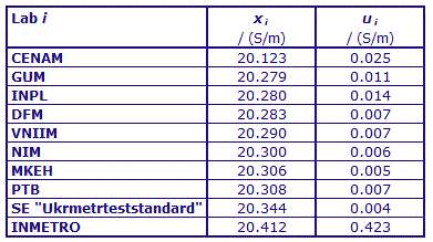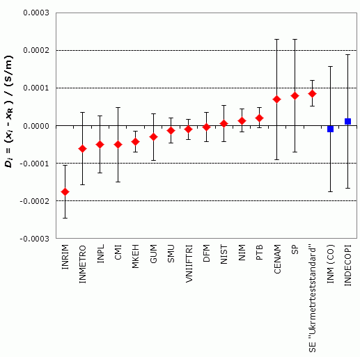 The degree of equivalence of laboratory i participant in SIM.QM-K92 only relative to the CCQM-K92 key comparison reference value is given by a pair of terms: Di and Ui, its expanded uncertainty (k = 2), both expressed in S/m and computed according to Equations 2 and 3 of the SIM.QM-K92 Final Report.  |