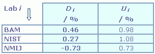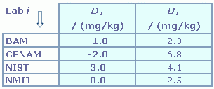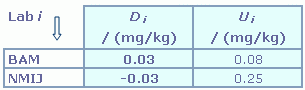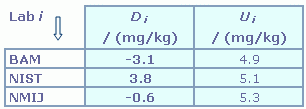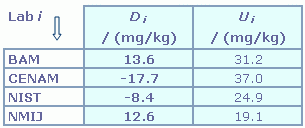 | The degree of equivalence of laboratory i relative to the key comparison reference value is given by a pair of terms, both expressed in (mg/kg): Di = (xi - xR) and its expanded uncertainty (k = 2) Ui = (ULab i2 + UR2)1/2. |