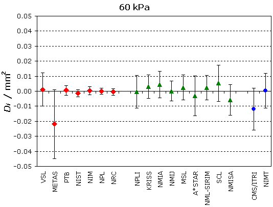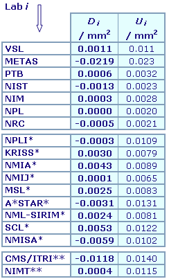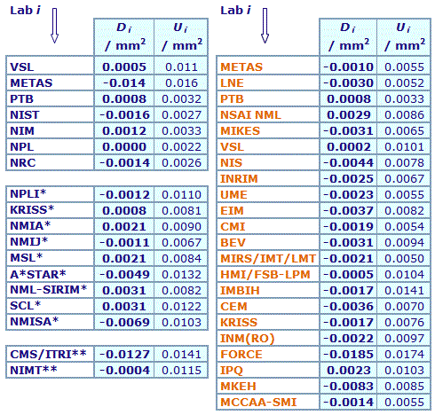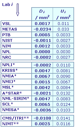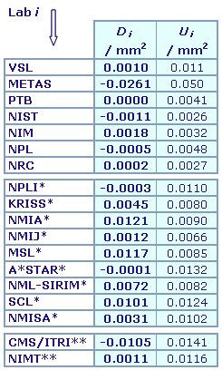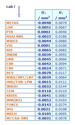 Degrees of equivalence relative to the CCM.P-K6 key comparison reference value, expressed in mm2