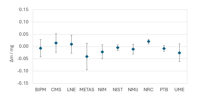 Graph caption: This graph depicts differences observed during the third key comparison between mass values attributed by the National Metrology Institutes (NMIs) to a nominal 1 kg mass and related standard uncertainties.