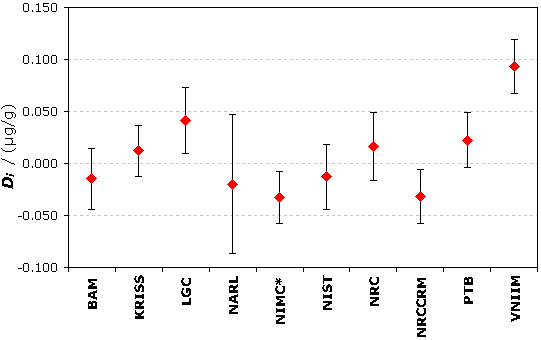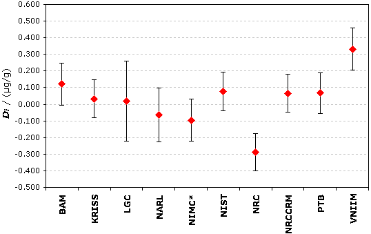 | The degree of equivalence of each laboratory with respect to the key comparison reference value is given by a pair of terms: Di = (xi - xR) and Ui, its expanded uncertainty corresponding to a 95% confidence interval, both expressed in µg/g. |