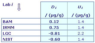 The degree of equivalence of laboratory i relative to the key comparison reference value is given by a pair of terms, both expressed in µg/g: |