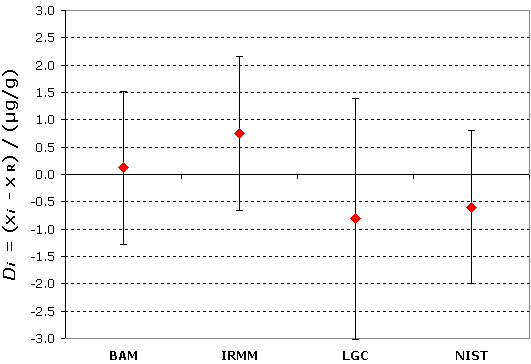 Degrees of equivalence: Di = (xi - xR) and expanded uncertainty Ui (k = 2), both expressed in µg/g