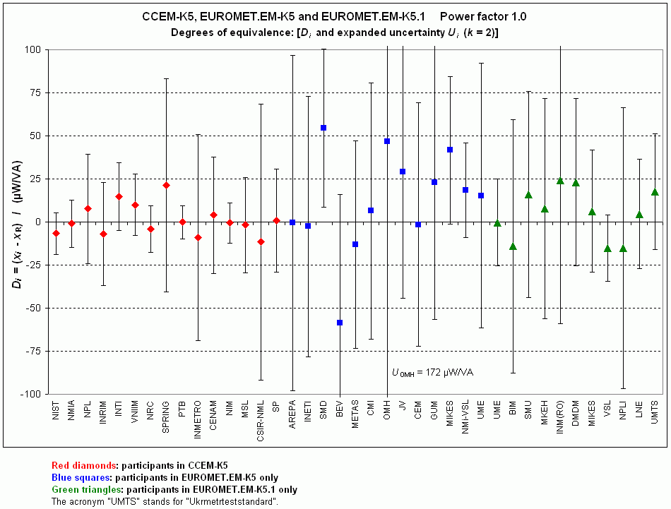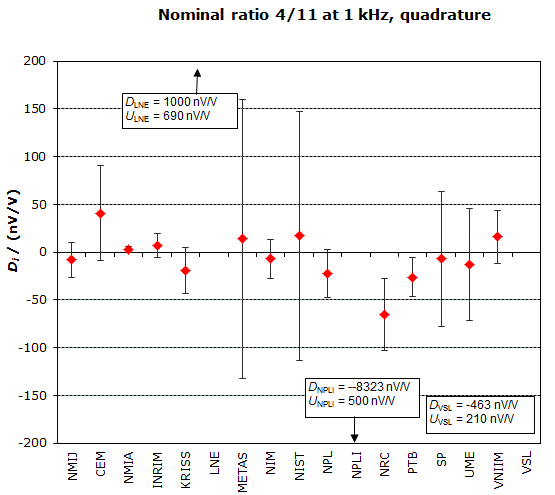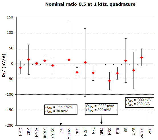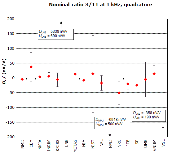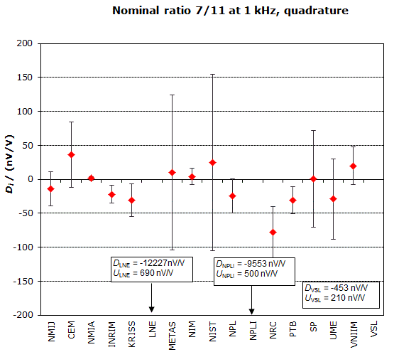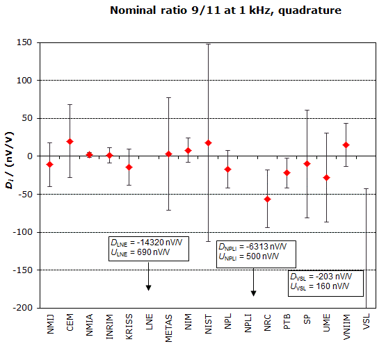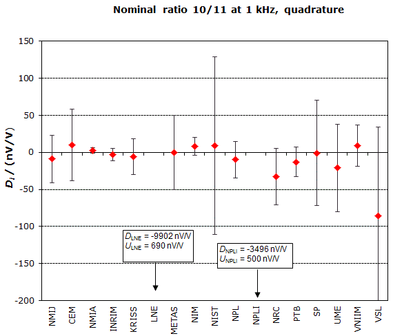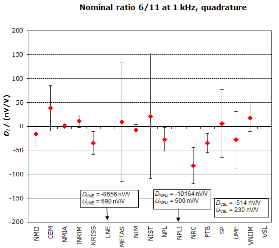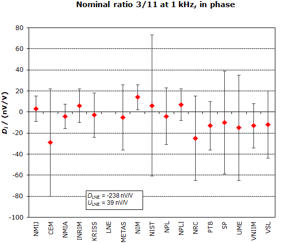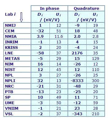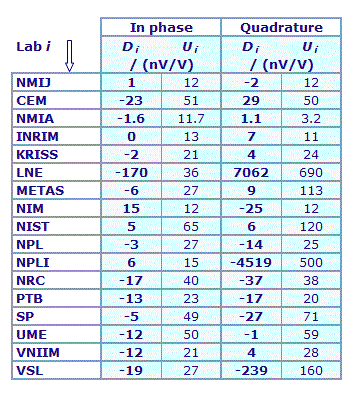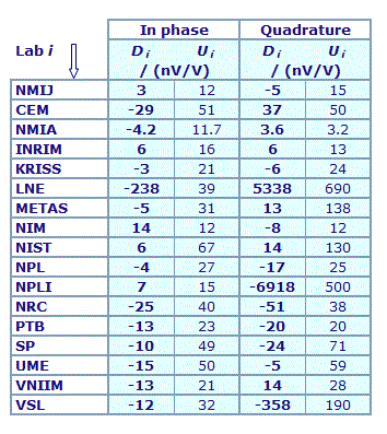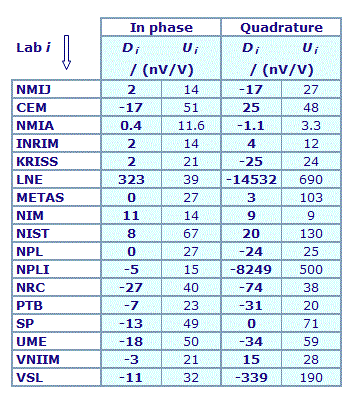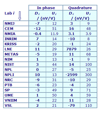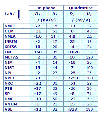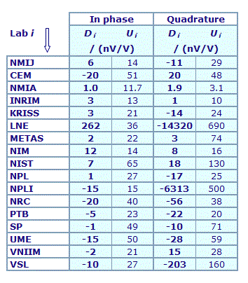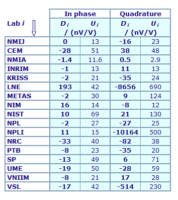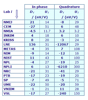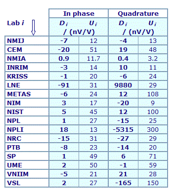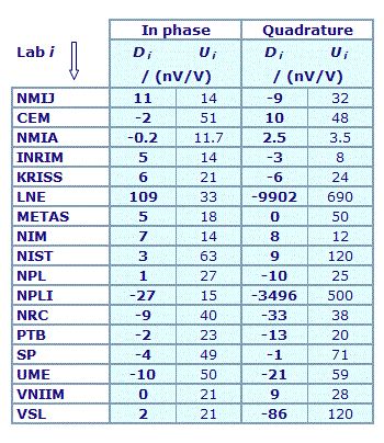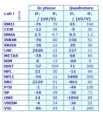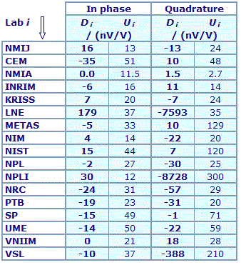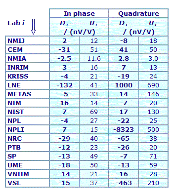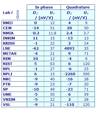 | The degree of equivalence of each laboratory with respect to the key comparison reference value is given by a pair of terms: Di and Ui, its expanded uncertainty (k = 2), both expressed in nV/V. |