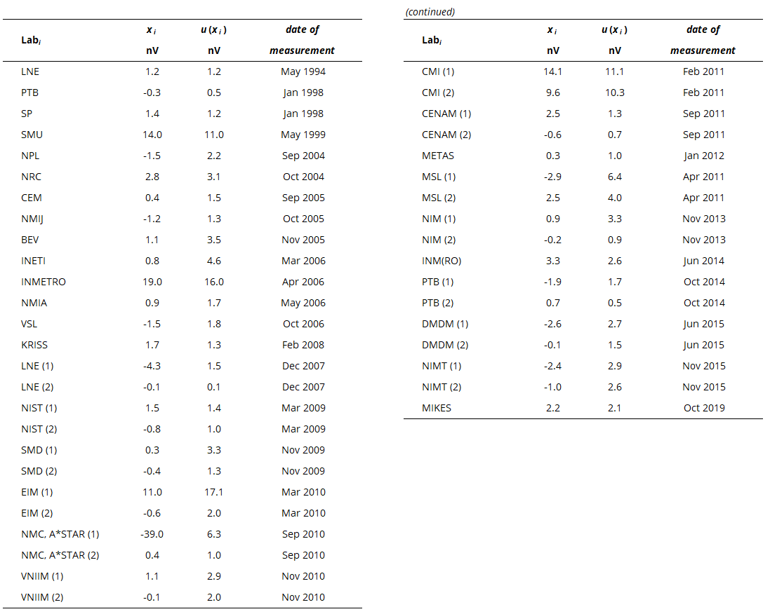The key comparison reference value is the BIPM value. Its standard uncertainty is evaluated to be 0.1 nV and is included in the ui values.